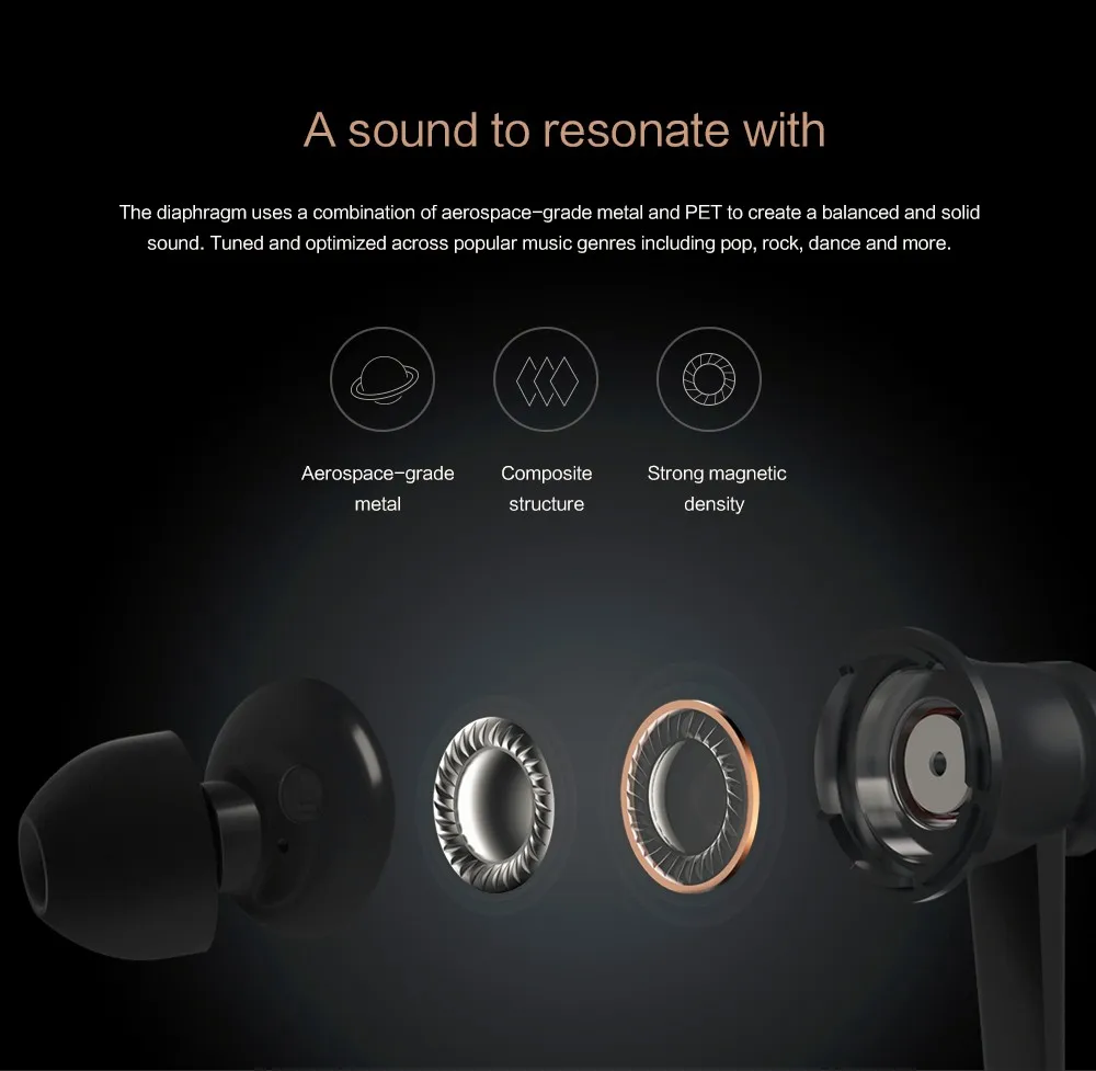 The diaphragm uses a combination of aerospace-grade metal and PET to create a balanced and solid sound.u0026nbsp;Tuned and optimized across popular music genres including pop, rock, dance and more.