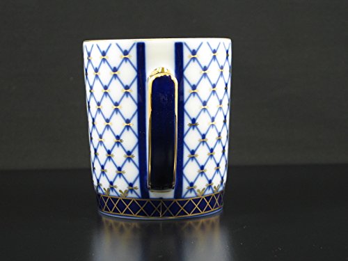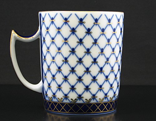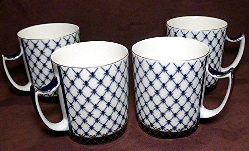-. Title : Fine Porcelain Russian Cobalt Blue Net Coffee Mug / Tea Cup, 22k Gold Accents, 12 oz, Set of 4, Lomonosov Ornament, Bone China