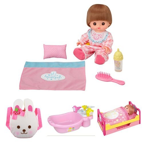 「おめめぱちくりネネちゃん」本体と「おんぶだっこひも」「メルちゃんのバスタブ」「いっしょにおねんねベッド 」の4点セットです。