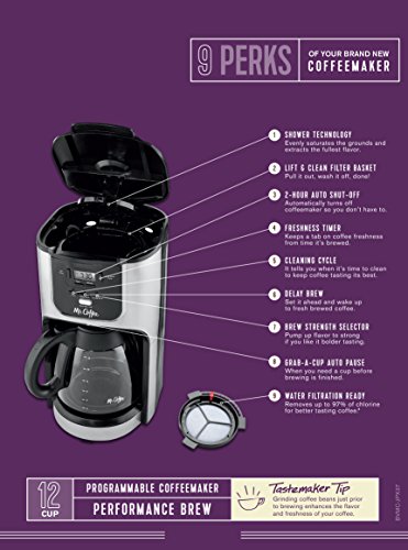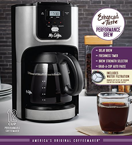 The Mr. Coffee 12-Cup Programmable Automatic Coffee Maker brings style, taste, and functionality together to create a rich blend that you'll savor for years to come. It features plenty of programmable options, like Delay Brew for coffee when you want it, or Brew Strength Selector to dial in the perfect taste. It also features a removable filter basket that lifts out for easy filling and cleaning. As coffee brews and that heavenly aroma fills the air, you don't have to wait until the cycle finishes to savor a cup, thanks to the convenient Grab-A-Cup Auto Pause feature.Feature