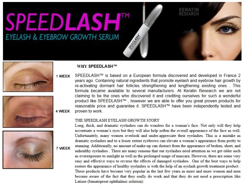 -. Binding : Misc. -. Brand : SPEEDLASH -. EAN : 0885141192100 -. Feature : SPEEDLASHTM is based on a European formula discovered and developed in France 4 years ago. Containing natural ingredients that promote eyelash and eyebrow hair growth by re-activating dormant hair follicles strengthening and lengthening existing ones / Long, thick, and dramatic eyelashes can do wonders for a woman's face. Not only will they help accentuate a woman's eyes but they will also help soften the overall appearance of the face as well. / All Natural No Side Effects Results in few weeks / Stronger and fuller lashes. Also support eyebrows / SPEEDLASHTM have been independently tested and proven to work. -. Label : Keratin Research -. Manufacturer : Keratin Research -. Model : SPX2 -. MPN : 821040911114 -. PackageQuantity : 1 -. PartNumber : 821040911114 -. ProductGroup : Beauty -. ProductTypeName : BEAUTY -. Publisher : Keratin Research -. Studio : Keratin Research -. Title : SPEEDLASH Eyelash Growth amazing results Natural Ingredients 2 for 1 offer -. UPC : 885141192100