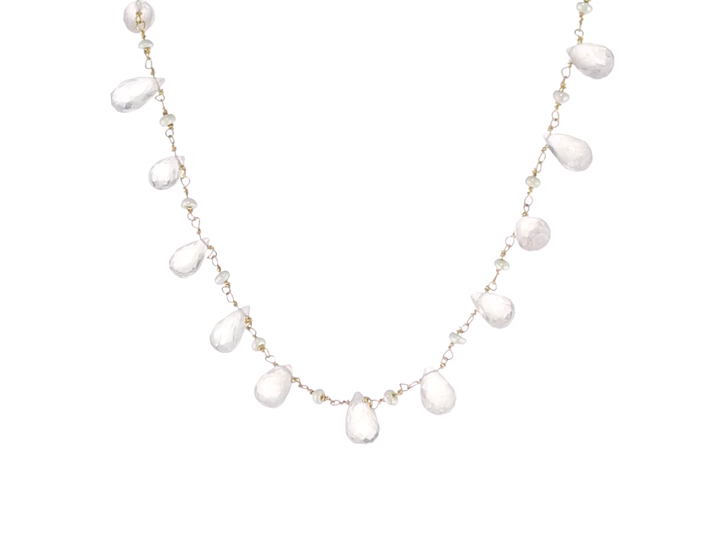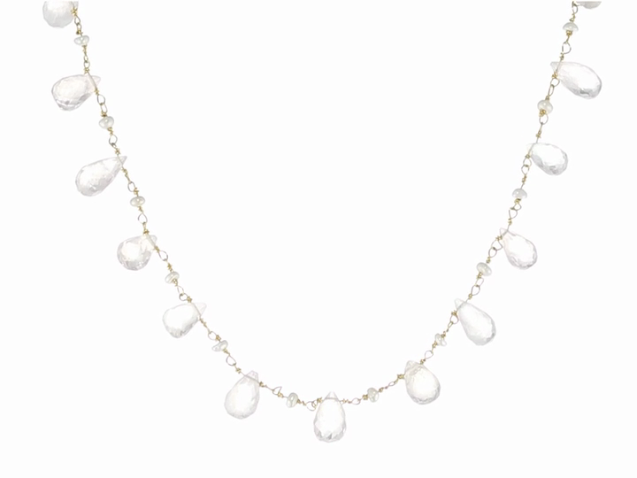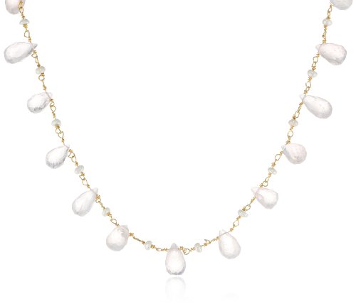 Suspended from a delicate chain of gold-plated sterling silver, the multi-sized topaz teardrops lend themselves to a natural look, while the small pearls punctuating the necklace add a bit of sophistication.