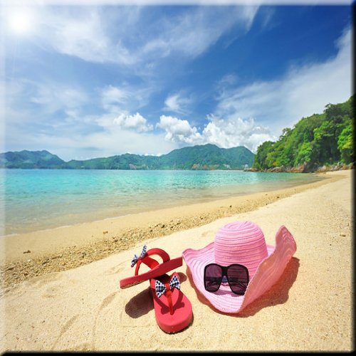 Rikki Knight RK-6intilec-8978 6" X 6" Pink Sunhat Flip-Flops on Sandy Beach Design Ceramic Art Tile
