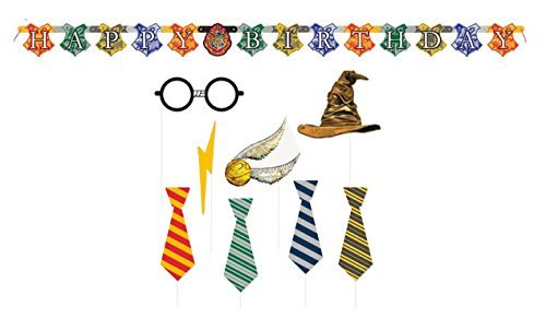 -. Feature : Harry Potter Children's Birthday Party ur / Includes 6 ft Happy Birthday Jointed Banner / Includes 8 pc Photo Props Featuring All 4 Houses of Harry Potter: Gryffindor, Slytherin, Ravenclaw and Huffelpuff / Props include 4 Hogwarts Ties, Lightning Bolt, Golden Snitch, Glasses and Hat / Transform Guests into Magical Wizards and Throw a Great Party!