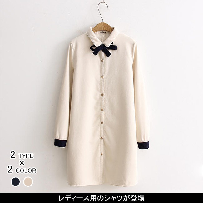 | 商品名 | レディース シャツ ロング丈 裏起毛 秋冬物 長袖 2タイプ 女性用 トップス リボン付き 厚手 ゆったり キュート スクール風 |