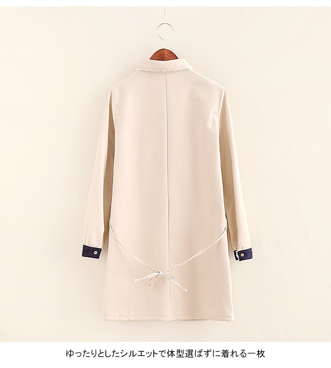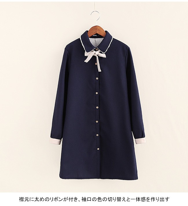 レディース用のシャツが登場 ナチュラル感溢れる素材を使い、エレガントなスクール風ロング仕様のシャツ 若い女性ならではの甘くて上品な淑やかさを引き立てる ゆったりとしたシルエットで体型選ばずに着れる一枚 襟元に太めのリボンが付き、袖口の色の切り替えと一体感を作り出す 通常仕様と裏起毛仕様の2タイプが用意され、季節次第に選べる | |