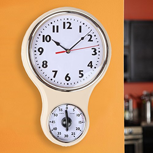 Our retro style, yet modern kitchen Timer clock has a built-in one-hour timer for cooking. Features easy-to-read retro modern type font. An attractive and practical piece for any kitchen that can use a spare timer. Large size, measure appox 8.5 inch wide at the top and 12.5 inch long. Require 1 "AA" battery (not included).