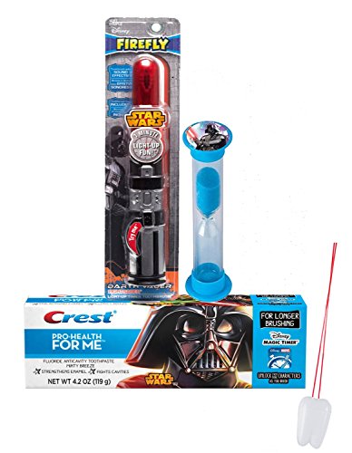 -. Binding : Health and Beauty -. Brand : Disney -. EAN : 0761656260025 -. Feature : (1) Firefly Star Wars Darth Varder Red Lightsaber Lightup Soft Manual Toothbrush With Sound Effects! / (1) Crest Pro-Health Jr. Star Wars Kids Minty Breeze Fluoride Anticavity Toothpaste, 4.2 oz / (1) 2 Minute Dentist Recommened Darth Vader Brushing Timer To Encourage Proper Brushing! / Plus Bonus "Remember to Brush" Visual Aid / Hang it in their bathroom or by their bed so they remember to keep their chompers sparkly fresh. You could also use these tooth charms to save one of your child's baby teeth! -. IsAdultProduct : 0 -. Label : Crest -. Manufacturer : Crest -. MPN : 3700091978 -. PackageQuantity : 3 -. PartNumber : 3700091978 -. ProductGroup : Health and Beauty -. ProductTypeName : HEALTH_PERSONAL_CARE -. Publisher : Crest -. Studio : Crest -. Title : Star Wars Darth Vader Inspired 3pc Bright Smile Oral Hygiene Set! Lightsaver Light Up Toothbrush, Toothpaste & Brushing Timer! Plus Bonus "Remember to Brush" Visual Aid! -. UPC : 761656260025