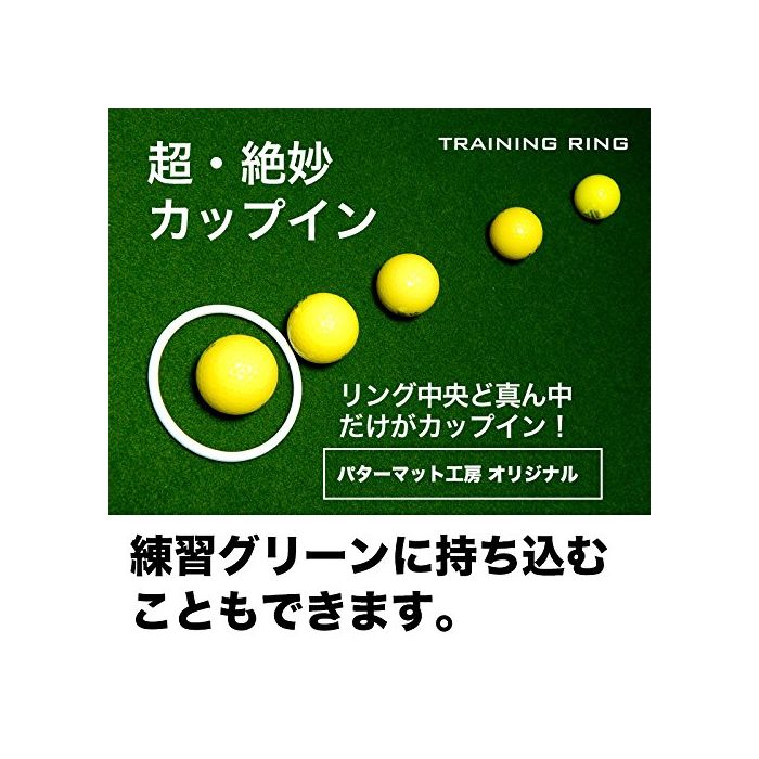 퍼터 매트 공방 오리지날의 연습 용구「트레이닝 링(난관 컵)」부착.직경8센티의 맞춤진 원 플라스틱 링.실제의 그린의 컵(10.8cm)보다도 한결 작은 사이즈.링 한가운데의 약2cm의 라인에 직모퉁이에 들어 가는 파《딘구》이외는,튀겨 버립니다.50cm?1m의 거리는 간단하게 들어 가지만,2m의 패드에서는 난이도가 비싸고, 3m의 패드는 매우 어렵게 됩니다.내려와 그린이 신중하고도 절묘한 패드에 상당히 하여 집중력이 한없이 높아집니다.SUPER-BENT퍼터 매트와 트레이닝 링의 세트는,이 페이지 만으로 판매중의 한정 기획입니다.
