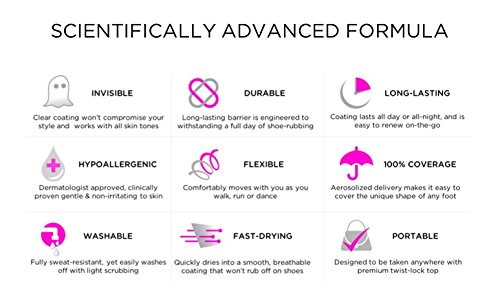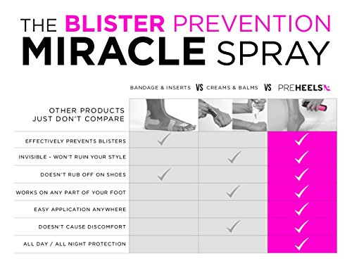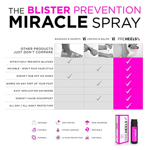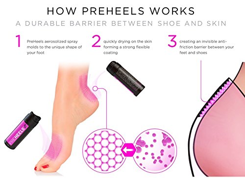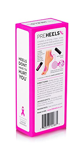 -. Feature : INVISIBLE & DURABLE - Balms don't work. Bandages are ugly. PreHeels creates a strong, totally clear barrier on your skin that blocks friction and prevent blisters & irritation from shoes, all day or all night. / PERFECT COVERAGE - proP.R.Ietary formula dries quickly into a barrier that conforms perfectly to the unique shape of your foot, providing optimal coverage anywhere you need it, and staying in place (unlike messy balms and creams that rub off on your shoes, or unsightly bandages which quickly fall off). / DERMATOLOGIST RECOMMENDED - hypoallergenic, gentle on skin and clinically proven safe & effective. Fully breathable and sweat resistant, yet can be washed off easily with light soap and warm water. / NOT JUST FOR HEELS - PreHeels is designed to for both women & men to prevent any type of shoes friction, or any other source of skin chafing. / PREHEELS GIVES BACK - 5% of all PreHeels profits are donated to the Cancer Research Institute to support cutting-edge research into new immunotherapy treatments for cancer.