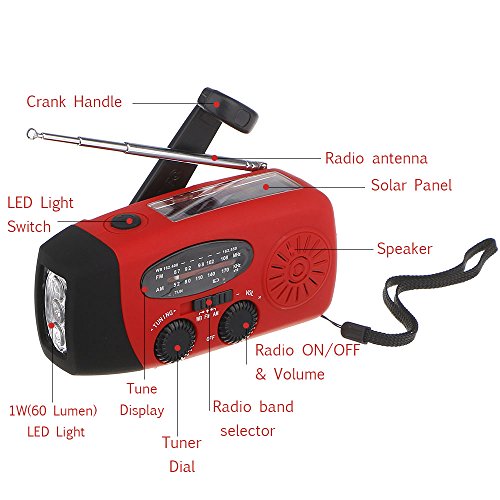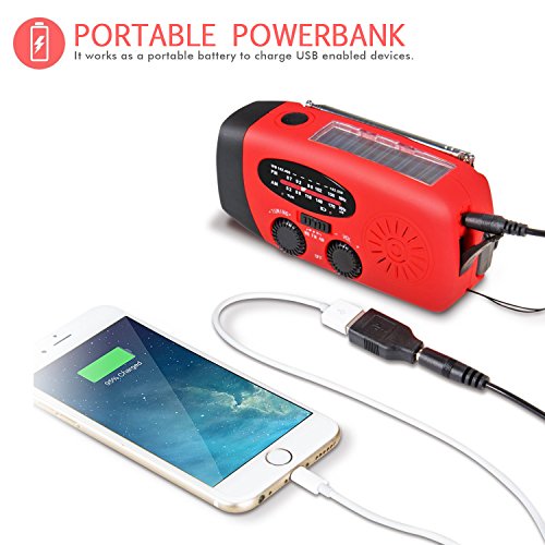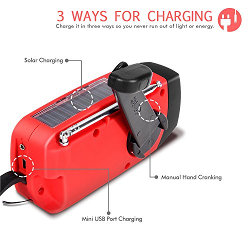 [3 Charging Ways] It supports 3 charging ways - Solar: exposing solar panel to direct sunlight; Handcrank: hand cranking it to wind up internal alternator; USB port charging: connecting it to computer via a mini USB Jack.