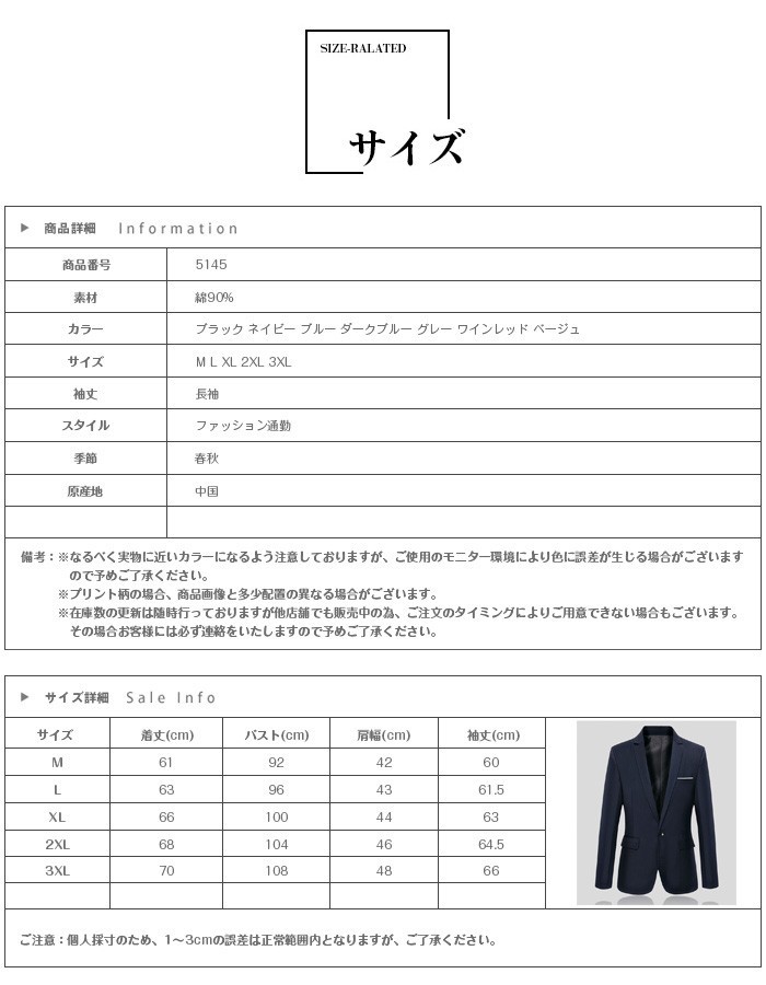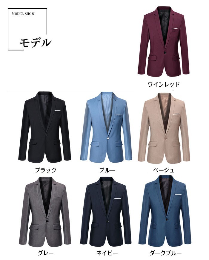 テーラードジャケット メンズ 春 アウター ショート丈 大きいサイズ コート 全5色 カラージャケット 無地 フォーマル オフィス 通勤 春夏秋冬テーラードジャケット メンズ 春 アウター ショート丈 無地全体のラインがとてもキレイでスマートな印象☆テーラードジャケット胸ポケットの仕様に注目。個性的な、オシャレな一品に仕上がりました。シャツと合わせてフォーマルに、Tシャツと合わせてカジュアルなど、スタイルに合わせて様々な着こなしが出来る定番アイテムです!商品詳細:素材:綿90%カラー:ブラック ネイビー ブルー ダークブルー グレー ワインレッド ベージュサイズ:M L XL 2XL 3XL袖丈:長袖スタイル:ファッション通勤季節:春秋原産地:中国テーラードジャケット メンズ 春 アウター ショート丈 大きいサイズ コート 全5色 カラージャケット 無地 フォーマル オフィス 通勤 春夏秋冬テーラードジャケット メンズ 春 アウター ショート丈 無地