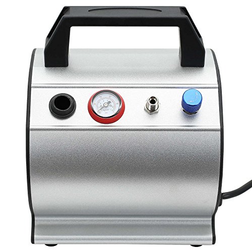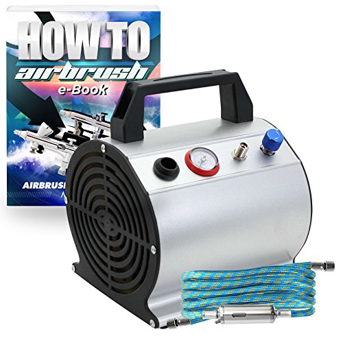 - POWERFUL YET ULTRA-QUIET: This 1/6 horsepower airbrush compressor delivers excellent power with approximate air delivery of 0.8 CFM, with ultra-quiet operation (49 dB). Includes a 6’ braided air hose with inline moisture filter. Oil-less design makes this compressor suitable for food decorating and body/nail art along with all other standard airbrushing applications.