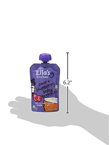 Ella's Kitchen Organic Pear + Blueberry Baby Brekkie, Stage 2 from 6 months, 3.5 Ounce Pouch. Pear + blueberry baby brekkie is a yummy mix of pear and blueberry yogurt and ground brown rice. Active babies will love this filling breakfast made from only certified USDA organic ingredients. Moms and dads will love the convenient resealable pouch full of healthy pear and blueberry yogurty goodness. Also great as a snack or dessert. Our mission is to develop healthy eating habits that last a lifetime by offering a range of tasty, natural and healthy USDA certified organic foods for babies and kids, which are handy for moms + dads and fun for little ones.Feature