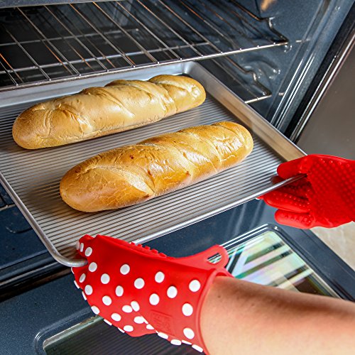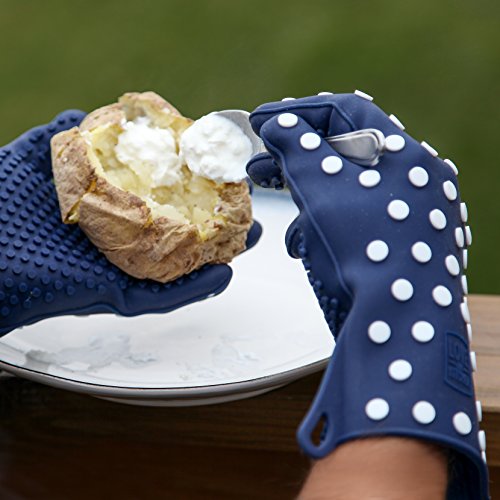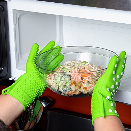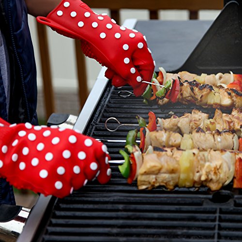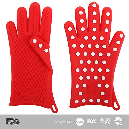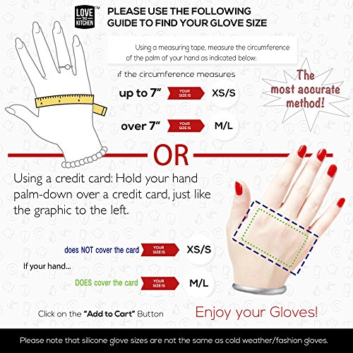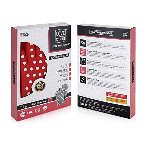 - Feature : Ultra-flexible, premium FDA approved silicone material makes these oven gloves bend with the natural movement of your hands. No more bulky, frustrating, oversized mitts and gloves. Smaller sizes (XS/S or M/L) fit a woman's hands without extra fingertip length to get in the way. You can even pick up small items like a dropped noodle or a runaway pea. / Vibrant colors and cute polka-dot design that matches your kitchen or just your mood, these gloves are as fun to wear as they are useful. Choose from red, yellow, green or blue. Each pair includes a right and left glove for added comfort. / Nonstick surface is 100% waterproof, stain-free & dishwasher safe for easy cleanup, removing everything from honey and marinade to oils and grease. Silicone gloves won't mold, mildew or harbor bacteria like cloth gloves. / Heat Shield Glove (tm) by Love This Kitchen (tm) are heat-resistant up to 442 degrees F for complete protection of the backs of your hands, fingers and palms while grilling, cooking or baking - Best Women's Barbecue Gloves available! / Perfect as a last minute gift, these gloves come in an attractive box & they ship fast - direct from Amazon's warehouses all across the country. Get it in time for mother's day with Amazon next day, 2-day or standard shipping. Order Now with peace of mind with our 60 days Money Back Guarantee plus our Limited Lifetime Replacement Guarantee! - And consider getting two - one for you and one for mom on her day!