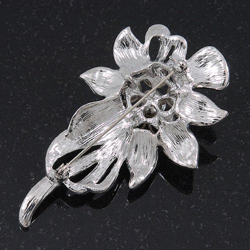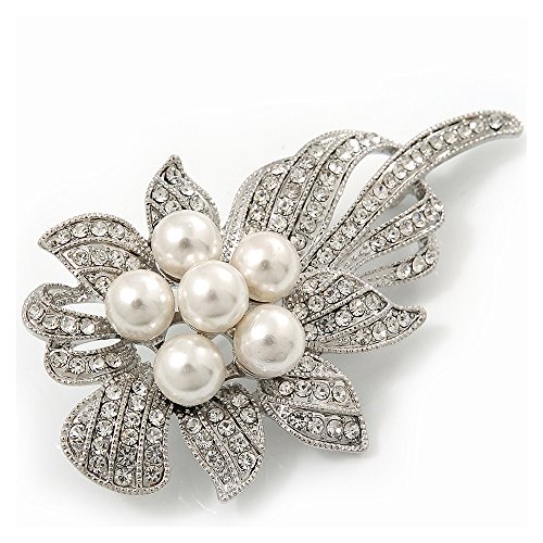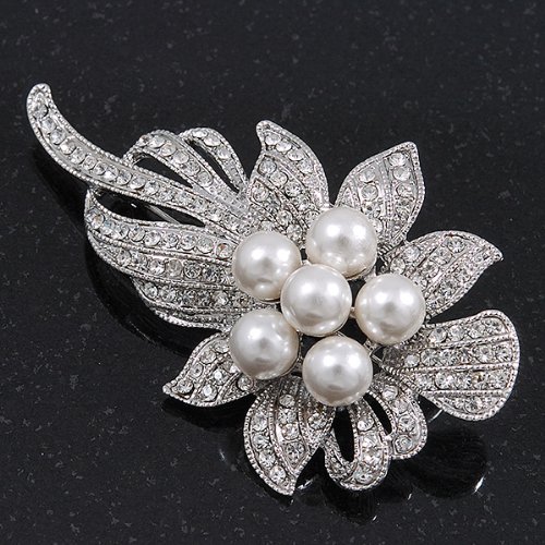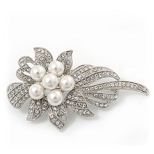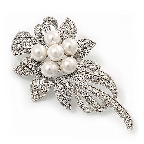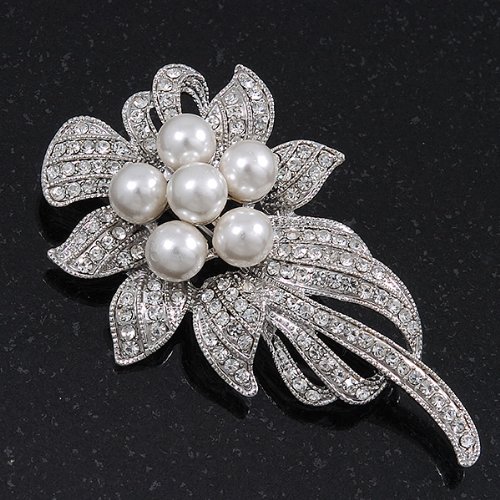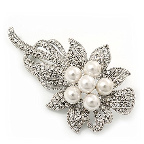 -. Title : Bridal Swarovski Crystal Synthetic Pearl Floral Brooch In Rhodium Plating - 7cm Length