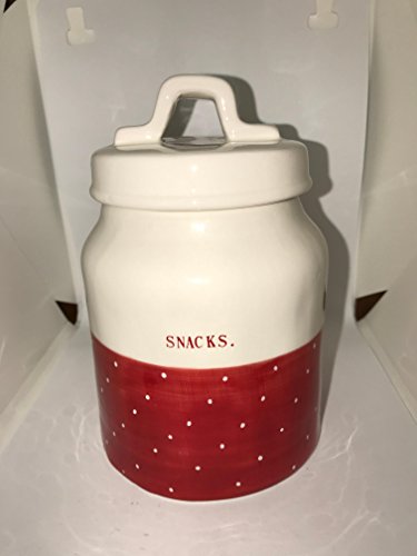 RARE Rae Dunn by Magenta Snacks in typeset 6 inch Cookie Jar Canister with Christmas Red Polka Dot exterior.