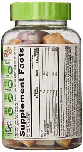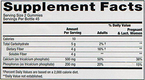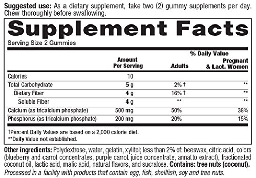 -. Feature : 4 g of fiber plus 500 mg of Calcium / Supports bone health* / Supports digestive health* / Great tasting gummies with natural orange and pomegranate flavors