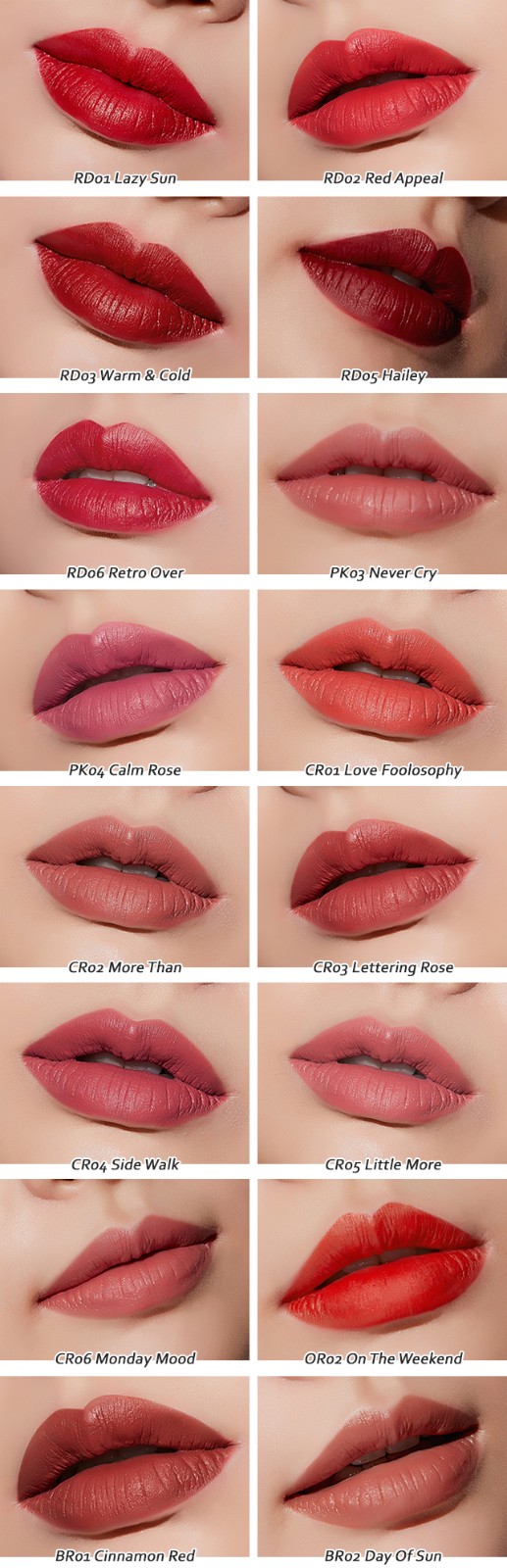 What it is Vivid matte lipstick with soft, lightweight, and smooth texture Detail Capacity 3.5g Recommended for All skin types How to use Apply a suitable amount on lips Option