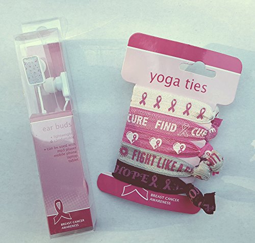 -. Title : Pink/Grey Ribbon Ear Buds and Yoga Hair Ties - Breast Cancer Awareness