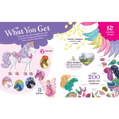 Comes with: 6 punch-out paper horses, 6 pairs of paper wings, 3 paper-doll fairies, 200+ punch-out fashions, double-sided removable adhesive dots, 4 playscapes, storage envelope