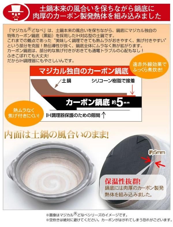 | 白い刷毛目が引き立つ四日市萬古焼。マジカル独自の特殊カーボン鍋底(黒鉛)を採用。IHで効率よく発熱し、熱伝導性が良く鍋底全体にムラなく熱が拡がり、食材に熱を伝えます。IHでしっかり沸き、冷めにくい土鍋です。さらに電子レンジで温めなおすこともできます。 |