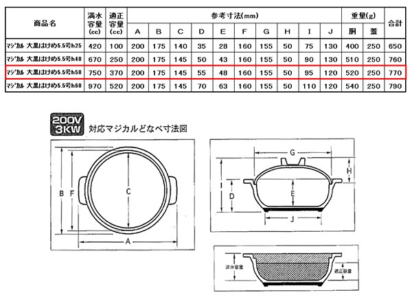 | 仕様 | 満水容量:750cc 適正容量:370cc 調理器SG認定商品 対応熱源 IHクッキングヒーター (200V/3KWまで対応) (卓上IH調理器:100V/700W~) ラジエントヒーター ガス直火 電子レンジ ハロゲンヒーター シーズヒーター |