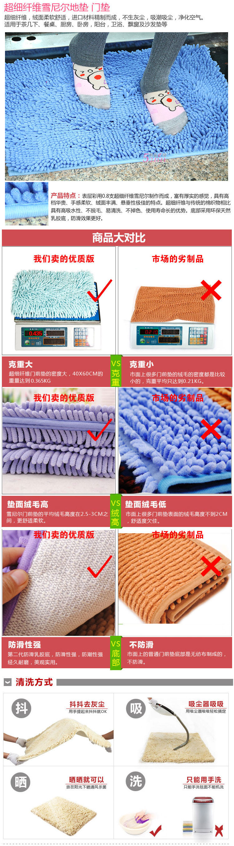 3 Compared with cotton chenille mat does not produce dust, fluff. Bottom evenly coated latex can increase friction with the floor, thus having an excellent anti-slip effect.