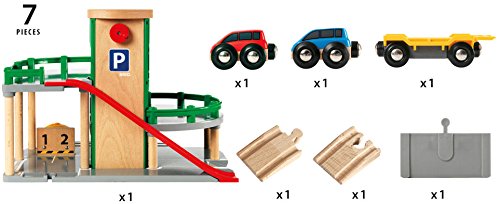 -. Feature : The ultimate parking structure to bring your BRIO railway and roadway together / Use the hand crank on the vehicle elevator to lift your cars to the top; use the special, sP.R.Ing-loaded trapdoor ramps to move down to the next level / Comes complete with 2 cars, car trailer, 2 rail ramps, road ramp, gas storage tank and numbered parking spaces / Works with all BRIO wooden railways, trains, vehicles and accessories / For ages 3+