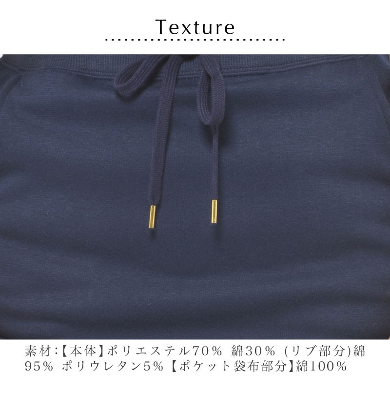 | 素材 | (本体)ポリエステル70% 綿30% (リブ部分)綿95% ポリウレタン5% (ポケット袋布部分)綿100% |
