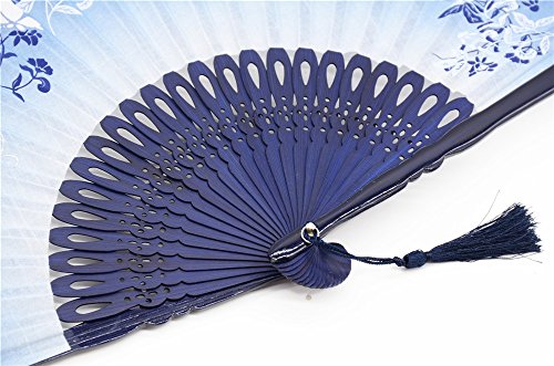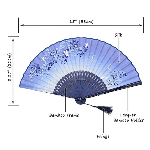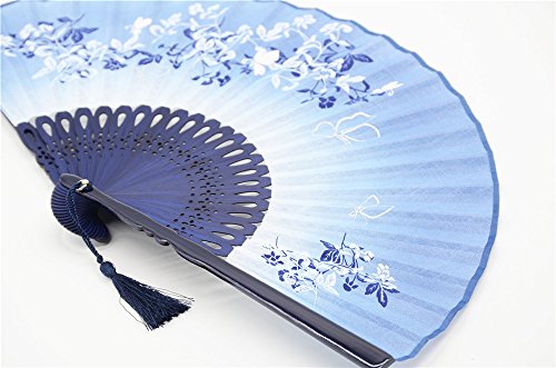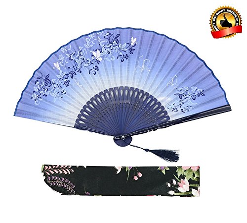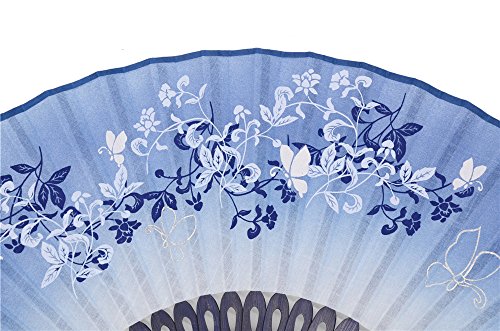 LYSA Folding Hand Held Flax Fans for Women - Silk Tissue Protective Sleeve --- Chinese/Japanese Style of "Morning Glory Flower and Butterfly" Pattern (Blue)