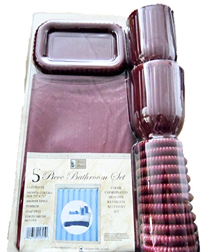 5 Piece Plastic Bathroom Accessories Set Shower Curtain, Rings, Tumbler, Soap Dish, Toothbrush Holder (Burgundy)