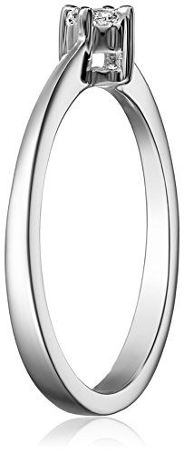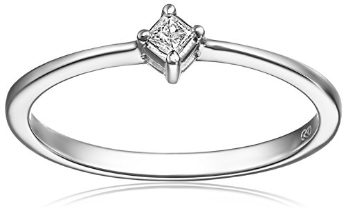 A single princess-cut diamond is set on point in this lovely promise ring, made from lustrous and durable 14 karat gold. The diamond has a weight of .07 carat and is held securely in a four-prong setting. It's centered on a slender polished gold band that tapers toward the top. This design is simple, elegant, and classy. Choose between white or yellow gold.Feature