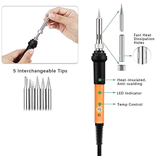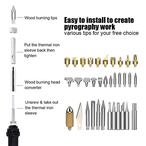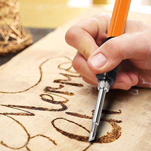 - 5,What You Get-1 x Adjustable temperature electric iron, 5 x soldering iron tips, 1 x converter, 10 x Assorted Wood Carving Tips, 5 x Assorted Wood Embossing Tips, 10 x Assorted Wood Burning & Soldering Tips, 1 x Hot Knife Chuck, 1 x Blade, 2 x Stencil, 1 x soldering Iron Holder, 1 x Instructions, 1 x Carring Bag (12-Month Warranty and Best Customer Service)