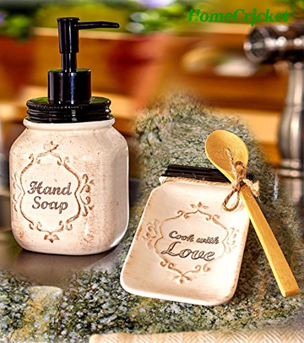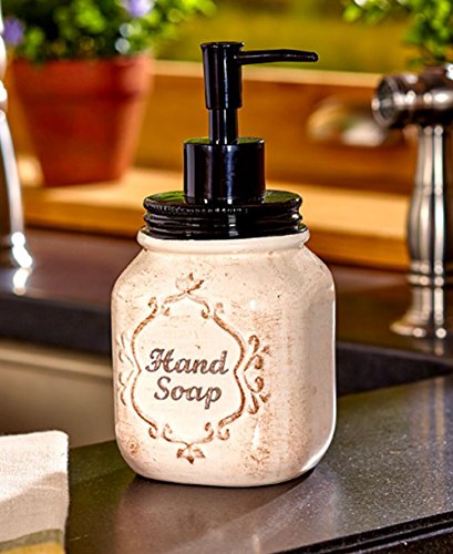 Beautiful decor for your kitchen The stylish country mason jar collection has a distressed finish for an antique country feel. The country mason Soap Dispenser (3-1/4" sq. x 7-1/8"H) features stylish scrollwork on its side.