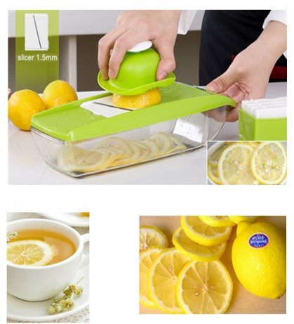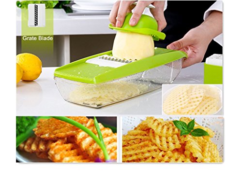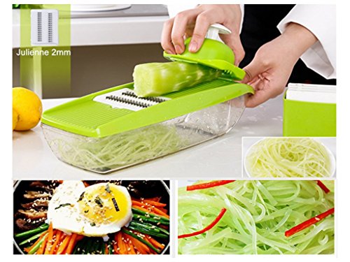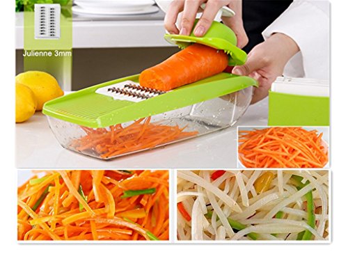 - 5 Different Thickness Stainless Steel Blade,including 1.5mm slicer, 2.5mm slicer, 2.0mm julienne cutter, 3.0mm julienne cutter and wavy slicer.You could easy to make tomato, cucumber or lemon slices, julienne carrot strips, waffled potato chips or grated cheese.