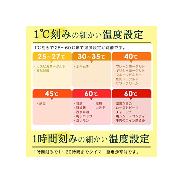 【온도와 시간 조절 가능】온도 설정은 25-60℃(1℃새김)고, 시간 설정은 1-60시간(1시간씩)고, 재료 로 인해 좋아하는 조리 시간 온도가 설정 가능합니다.발효 시간 온도 에 따라서는 좋아하는 경도나 신맛에 완성됩니다.