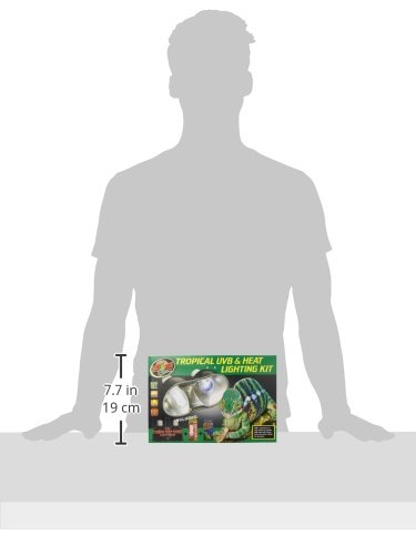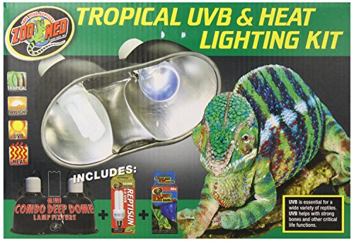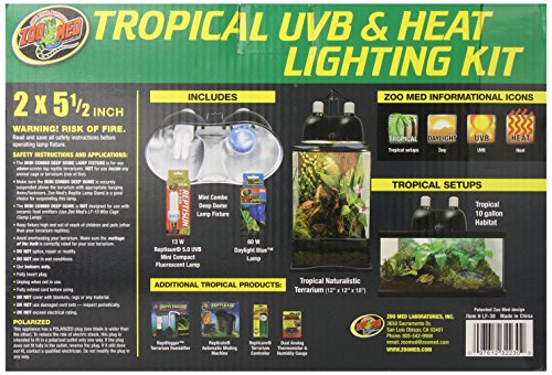 Zoo Med Tropical UVB & Heat Lighting Kit Tropical UVB & Heat Lighting Kit Includes: Mini Combo Deep Dome with Dual ceramic sockets for use with lamps up to 160 watts per socket. Dual on/off switches for greater convenience. Daylight Blue Reptile Bulb 60 watts. Bright, naturalistic daylight bulb for heating reptile or amphibian terrariums. True blue glass not painted or coated for better heat transfer made of European quality for long burn life ReptiSun 5.0 UVB Mini Compact Fluorescent. Perfect for small terrarium tropical species of reptiles and amphibians Provides UVB, UVA and visible light in a mini compact lamp.Feature