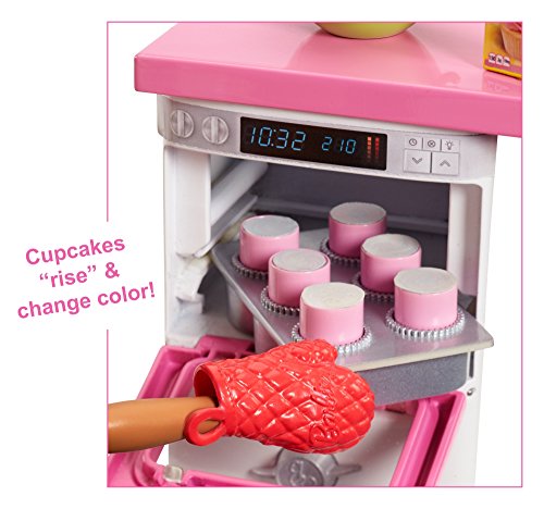 Young foodies can bake up fun with Barbie doll and this baking play set with oven and themed piece Count. The play set is designed to surprise and delight with fun working features: the pound cake "rises", the cupcakes "rise" and change color and the oven has "Ding" sound activation. Additional ingredients for storytelling include a bowl, icing bag, cake mix, utensils and oven mitt. Barbie doll can serve up the delicious baked goods in a sweet outfit with cupcake decal on the t-shirt and a colorful apron.Feature