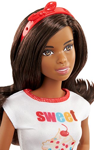 Barbie doll can serve up the delicious baked goods in a sweet outfit with cupcake decal on the t-shirt and a colorful apron