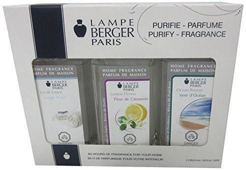 -. Binding : Misc. -. Brand : Lampe Berger -. Color : None -. EAN : 3127290239365 -. Feature : Fresh Linen, Lemon Flower, Ocean Breeze / Twenty minutes of burn time per 110 square feet is all you need to purify the air and leave it wonderfully fragranced / Made in France / 6.08 flu oz. each -. IsAutographed : 0 -. Label : Lampe Berger Paris -. Manufacturer : Lampe Berger Paris -. Model : 23936 -. MPN : 23936 -. PackageQuantity : 1 -. PartNumber : 23936 -. ProductGroup : Home -. ProductTypeName : HOME -. Publisher : Lampe Berger Paris -. Size : 3x 180ml -. Studio : Lampe Berger Paris -. Title : Lampe Berger Fragrance Trio Pack Fresh , Fresh Linen-Lemon Flower-Ocean Breeze, 3 x 180ml / 6.08 fl.oz