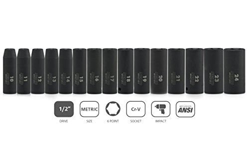 15 Pieces deep broach metric sockets come in a heavy duty custom case with size index for easy storage: 10, 11, 12, 13, 14, 15, 16, 17, 18, 19, 20, 21, 22, 23, 24 mm