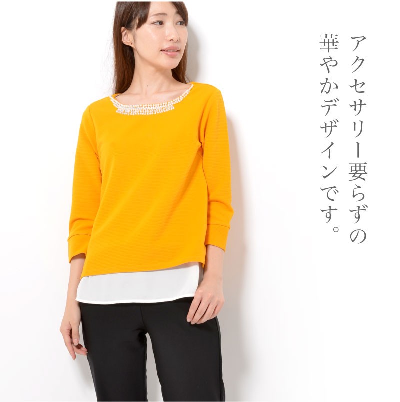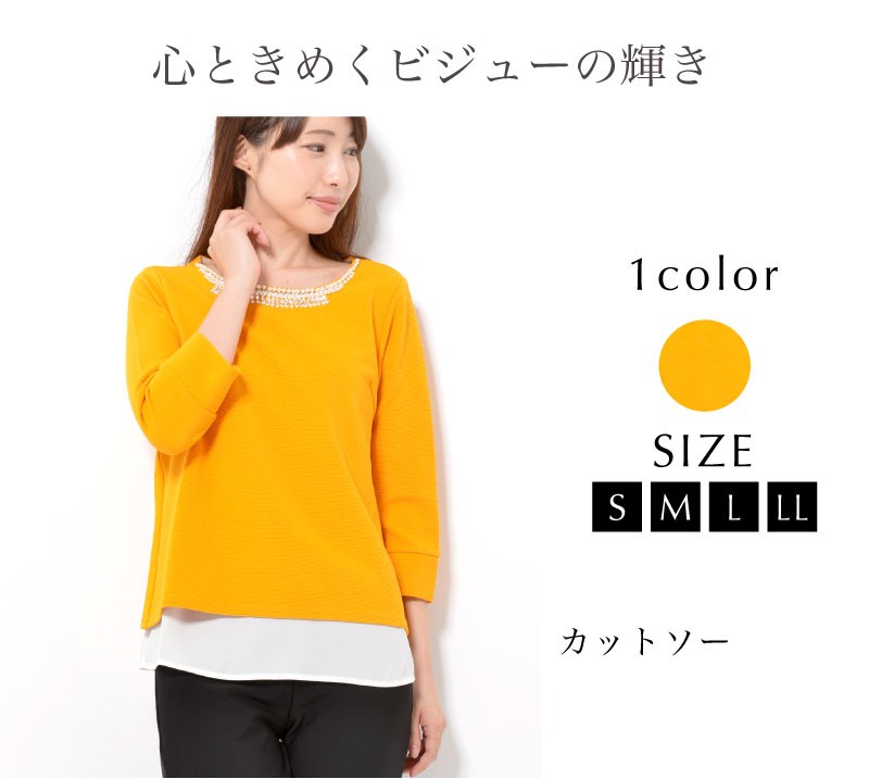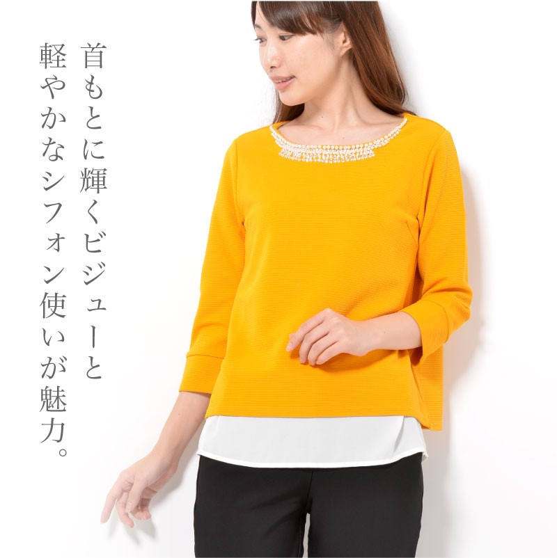 首もとに輝くビジューと軽やかなシフォン使いが魅力。