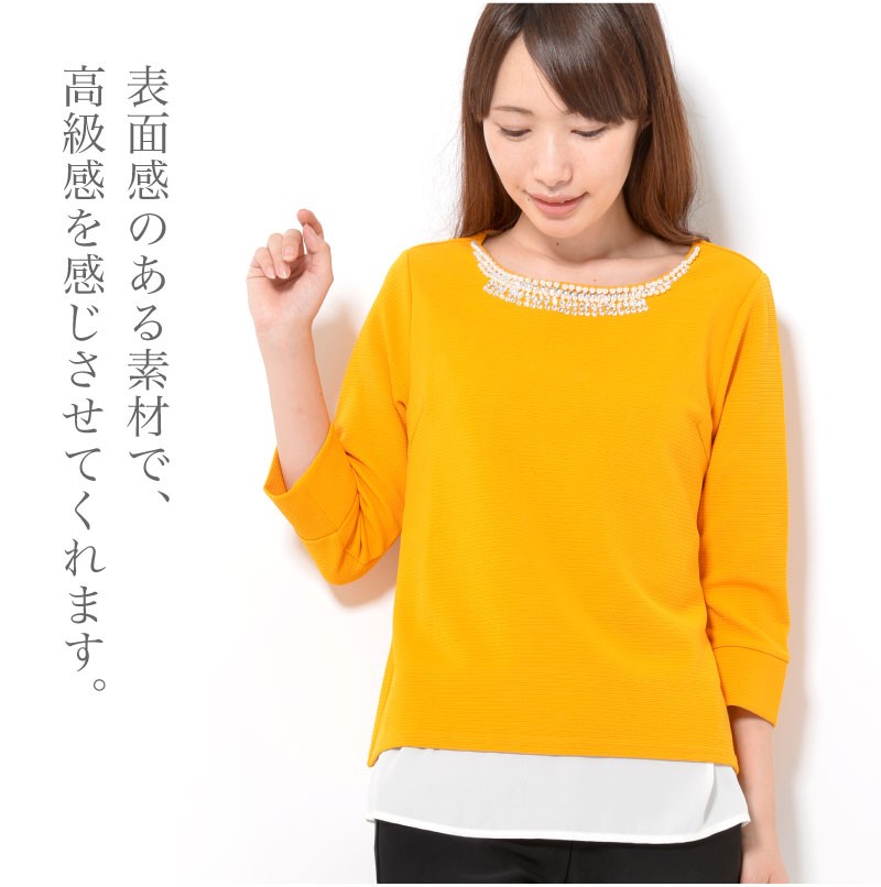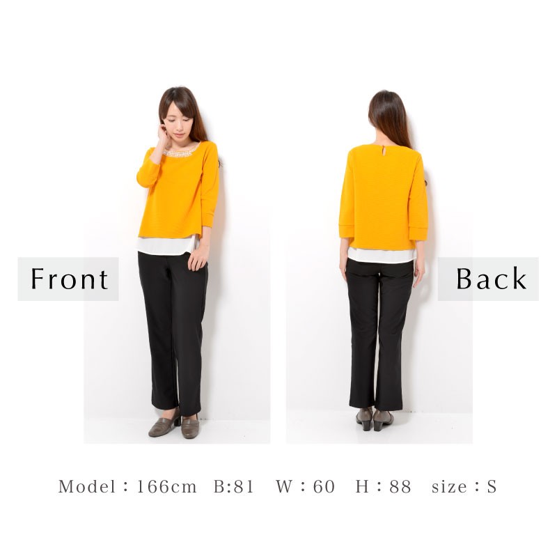 表面感のある素材で、高級感を感じさせてくれます。後ろ衿ぐりはボタン開きで、脱ぎ着がラク♪