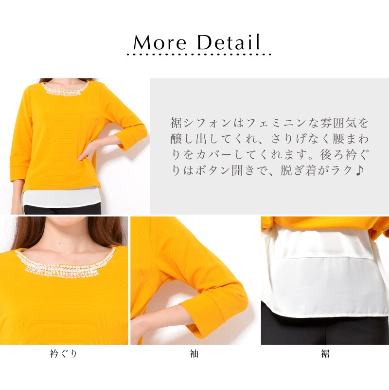 裾シフォンはフェミニンな雰囲気を醸し出してくれ、さりげなく腰まわりをカバーしてくれます。