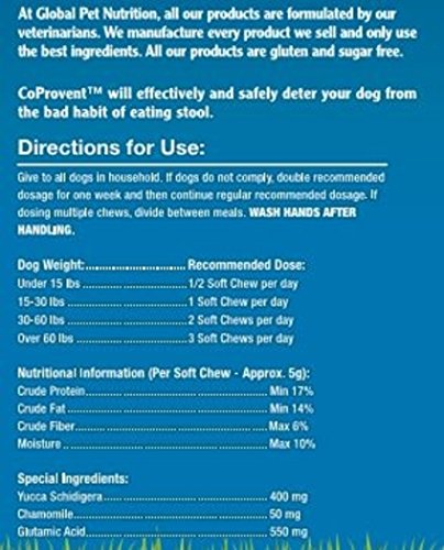 -. Binding : Misc. -. Brand : Global Pet -. EAN : 0850154006119 -. Feature : Safely & Effectively deter your dog from eating stool / Great smelling & tasting chew that will be easy to use as a treat / 400 mg of Yucca schidigera per chew / Gluten & Sugar Free -. Label : Global Pet Nutrition, LLC. -. Manufacturer : Global Pet Nutrition, LLC. -. Model : 2014131-01 -. MPN : 2014131-01 -. PackageQuantity : 1 -. PartNumber : 2014131-01 -. ProductGroup : Pet Products -. ProductTypeName : PET_SUPPLIES -. Publisher : Global Pet Nutrition, LLC. -. Size : 1" -. Studio : Global Pet Nutrition, LLC. -. Title : Global Pet Nutrition CoProvent Coprophagia 1 lb -. UPC : 850154006119
