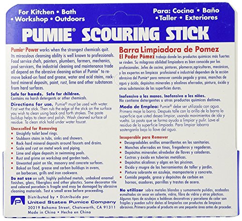 -. Brand : U.S. Pumice -. Color : Pumice -. Feature : U.S. Pumice scouring stick cleans where the strongest chemicals fail / U.S. Pumice works through gentle abrasive action / U.S. Pumice scours away mineral deposits, rust, stains and scale from sinks / Cleans baked-on food, grease and carbon buildup in ovens, on grills and iron cookware -. Label : U.S. Pumice -. Manufacturer : U.S. Pumice -. ProductGroup : Kitchen -. ProductTypeName : KITCHEN -. Publisher : U.S. Pumice -. Studio : U.S. Pumice -. Title : U.S. Pumice 1001 Scouring Stick