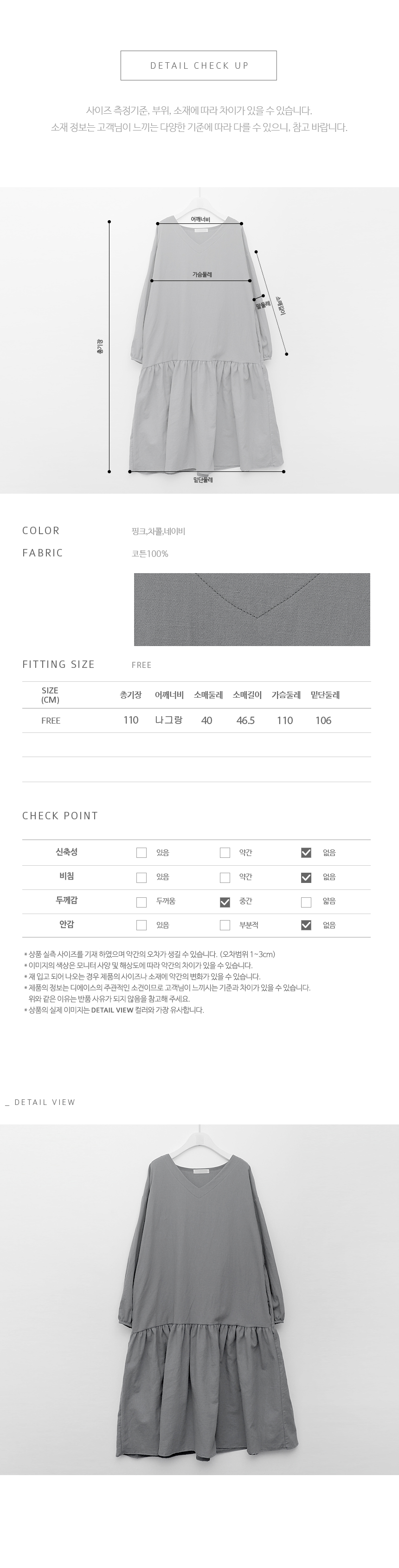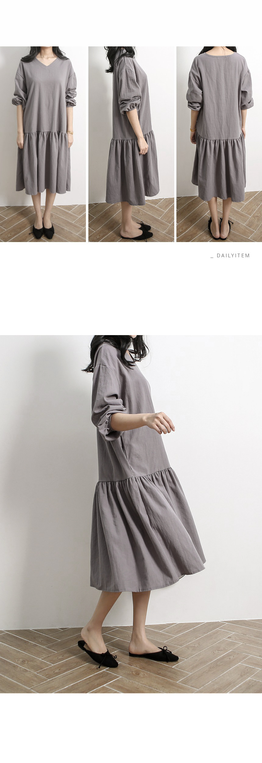 자연스러운 질감의 가벼운 코튼 100%의 소재감으로 산뜻하고 멋스럽게 입기 좋은 머메이드라인이 브이넥 원피스에요 깊지 않은 브이넥 목선이 시원하고 편안한 오버핏으로 데일리로 입기 좋은 아이템이랍니다 전체적으로 여유있는 핏에 허벅지선부터 연결된 플레어분량의 머메이드라인과 둥글에 마무리한 소매가 잘 어울려 여성스러워요 양쪽의 히든포켓이 있어 활용도도 좋고 편하답니다 색상은 핑크, 차콜, 네이비 사이즈는 FREE44~77