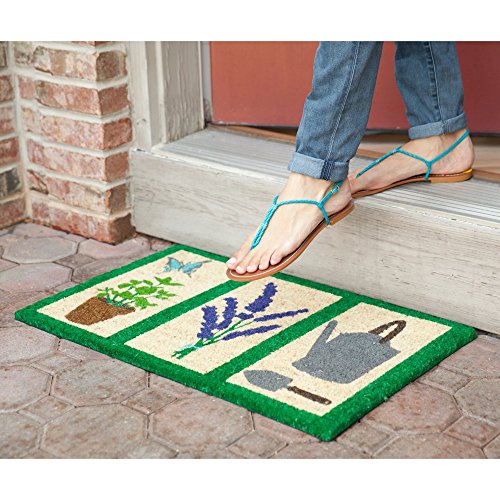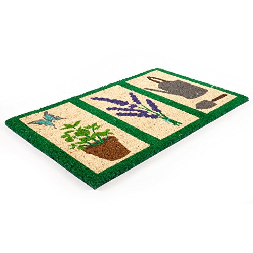 -. Feature : Dimensions: 17 x 28 in. / Multi-colored gardening motif / Crafted of all-natural coir with non-slip backing / Hand-stenciled with permanent fade-resistant dyes / Machine made in India