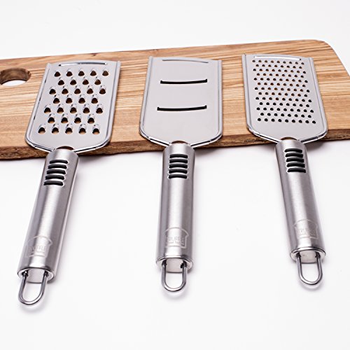 Set of 3 Professional Stainless Steel GRATERS for Cheese, Vegetables, Chocolate for kitchen preparation needs - FINE grater, COARSE grater and large SHAVER, with FREE Protective Fabric Bag